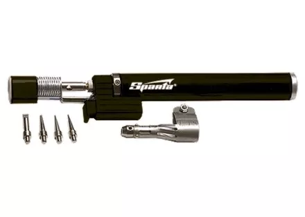 Горелка газовая тип "Карандаш" c пьезоподжигом + 4 насадки для пайки 200 мм SPARTA - удобная портативная газовая горелка общего назначения. Заправка осуществляется при помощи обычного баллончика для заправки зажигалок. Создает устойчивое, не подверженное воздействию ветра и дождя пламя температурой около 1300°C. В комплект входит две насадки для пайки. Данная модель горелки оснащена пъезоподжигом, что создаёт удобство при работе. В комплект входит четыре вида насадок для пайки.